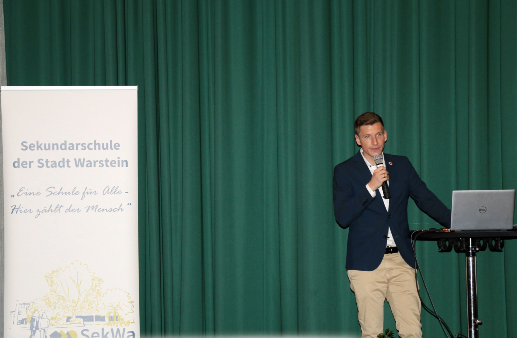 Auch der neue Bürgermeister der Stadt Warstein, Herr Maximilian Spinnrath, gehörte zu den Gästen. Er würdigte die Arbeit der Sekundarschule in warmen und herzlichen Worten und sicherte ihr zugleich seine Unterstützung zu.